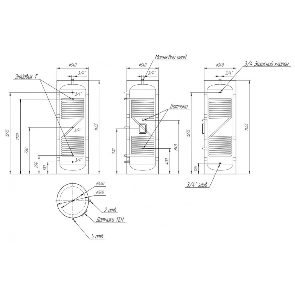 • Основне джерело нагрівання води - теплообмінний змійовик, який забезпечує ефективну роботу бака у складі системи з тепловим насосом, котлом або іншими джерелами тепла.