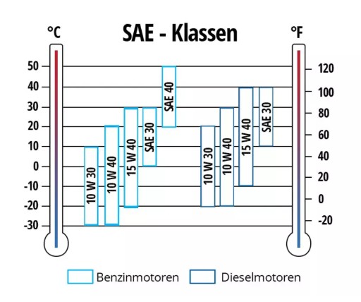 Для бензинових та дизельних двигунів вибір правильного класу в'язкості SAE залежить від температури зовнішнього повітря. Відповідні класи в'язкості SAE наведено у наступній таблиці. Приблизні значення можуть бути перевищені або занижені протягом короткого часу. Приклад: для бензинового двигуна, що працює в діапазоні температур від 0 до +20°C, рекомендується 10W40, 15W40 або SAE 30.