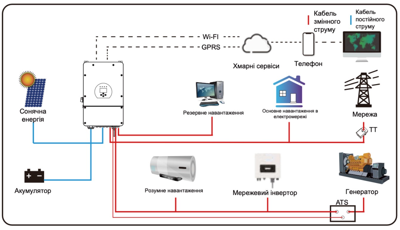 На следующей иллюстрации показано базовое применение этого инвертора. Он также должен включать следующие устройства, чтобы сформировать полную рабочую систему.