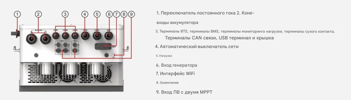 Оснащен портом CAN (x2) BMS и параллельным, x1 портом RS485 для BMS, x1RS232 портом для дистанционного управления, x1 портом DRM, что делает систему умной и гибкой.