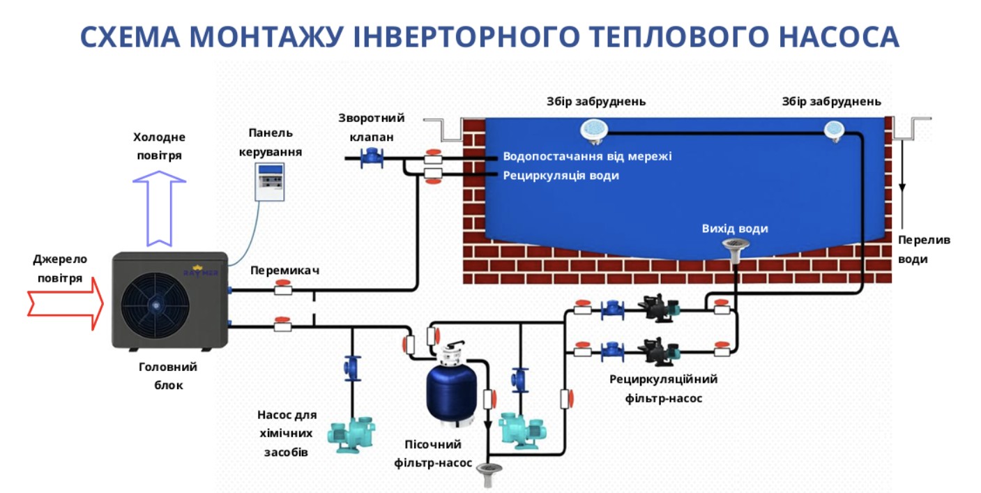Очищена вода подається на теплообмінник теплового насосу. Основний блок теплового насоса забирає тепло з повітря, нагріває воду і подає її назад у басейн через зворотну лінію.