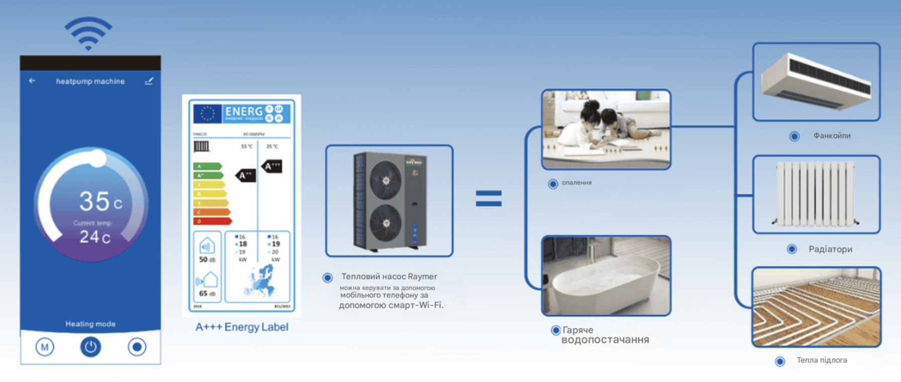 Тепловий насос Raymer Ray-18D2MN-EVI оснащений вбудованим модулем Wi-Fi, що дозволяє віддалено керувати системою через смартфон або планшет. Використовуючи зручний мобільний додаток, користувач отримує повний контроль: