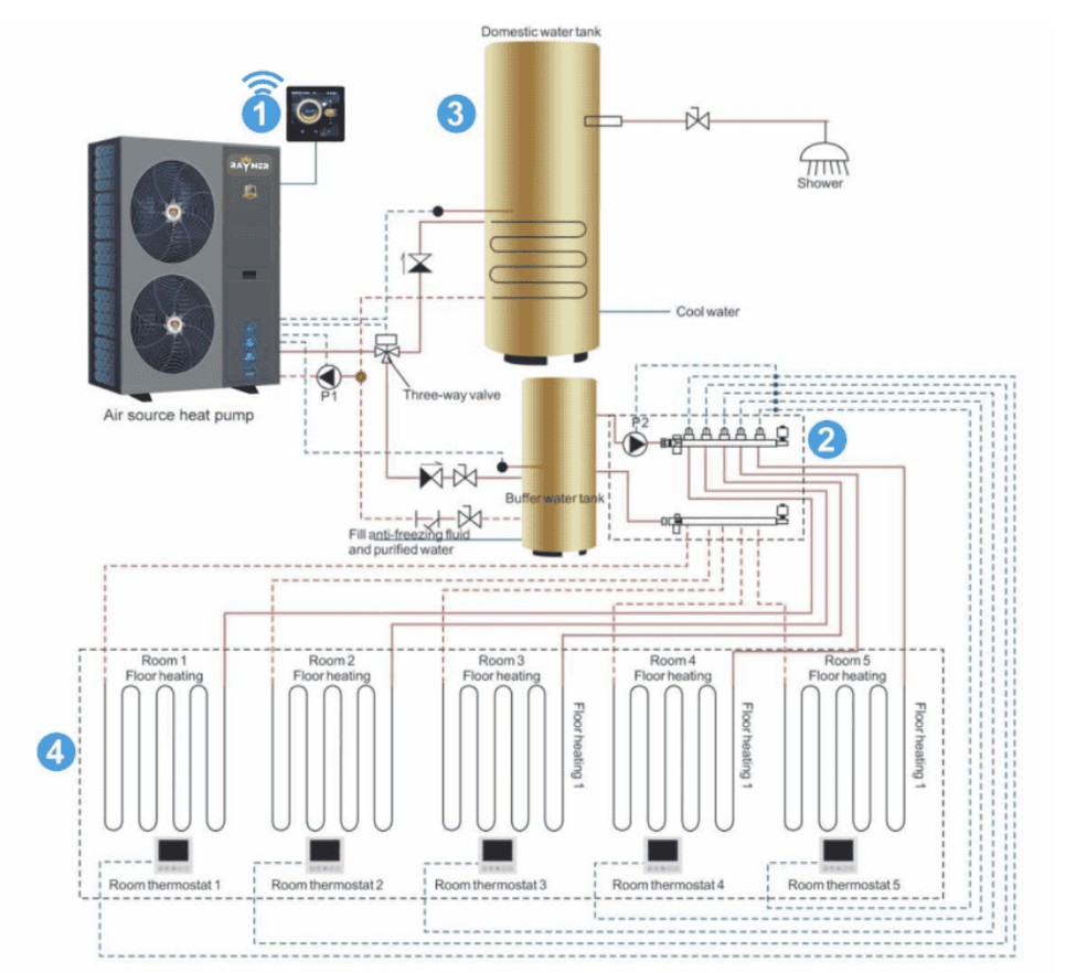 Система легко інтегрується з буферною ємністю, що дозволяє розділити будинок на зони опалення та індивідуально встановлювати температуру в кожній кімнаті. Це особливо актуально для двоповерхових будинків, де температури потреби різних поверхів відрізняються.