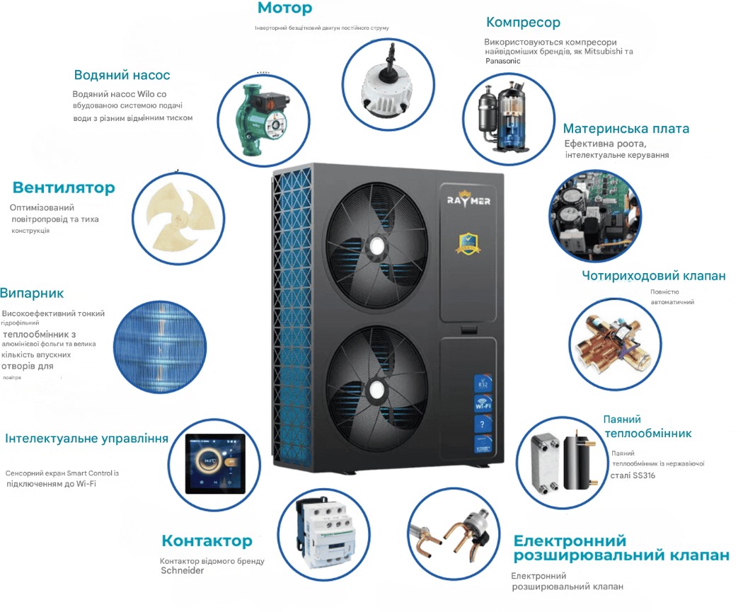 Тепловий насос Raymer Ray-18D2MN-EVI має продуманий набір, що забезпечує високу ефективність, надійність та зручність експлуатації: