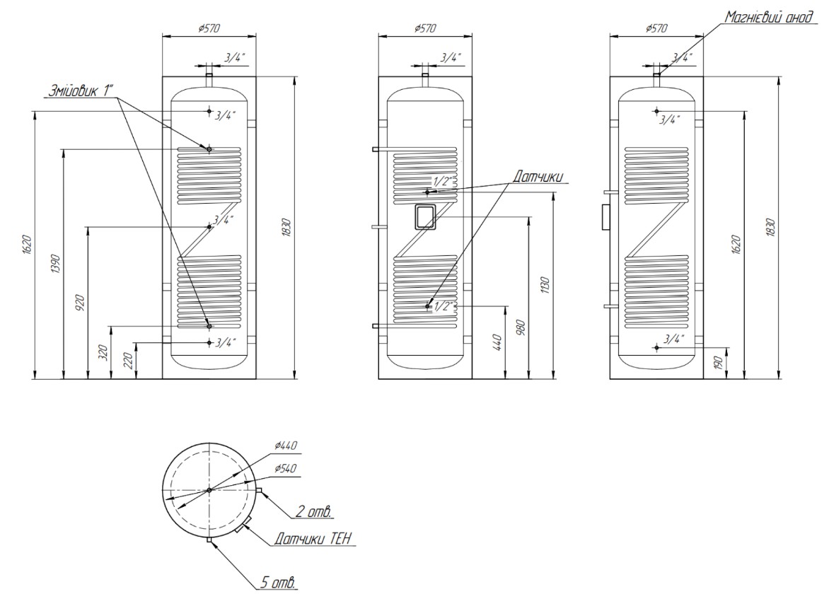 - Основне джерело нагрівання води - теплообмінний змійовик, який забезпечує ефективну роботу бака у складі системи з тепловим насосом, котлом або іншими джерелами тепла.