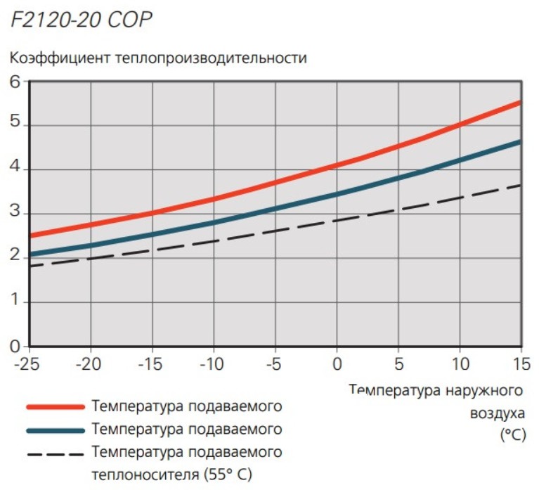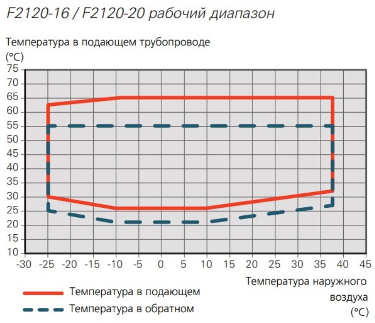 - Має найкращий у своєму класі робочий діапазон і забезпечує температуру подачі до 65°C. Навіть при температурі зовнішнього повітря -25°C F2120 забезпечує температуру подачі до 63°C