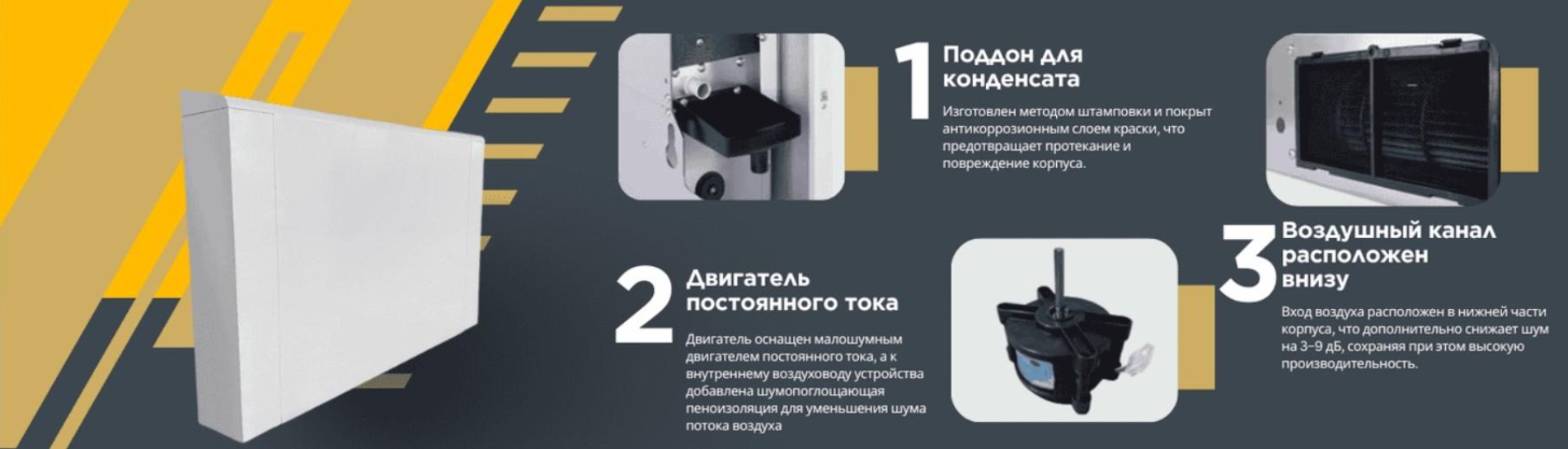 Благодаря гидрофильной фольге на теплообменнике и большой площади контакта воздуха с трубками, фанкойл демонстрирует отличную эффективность при минимальных энергозатратах.