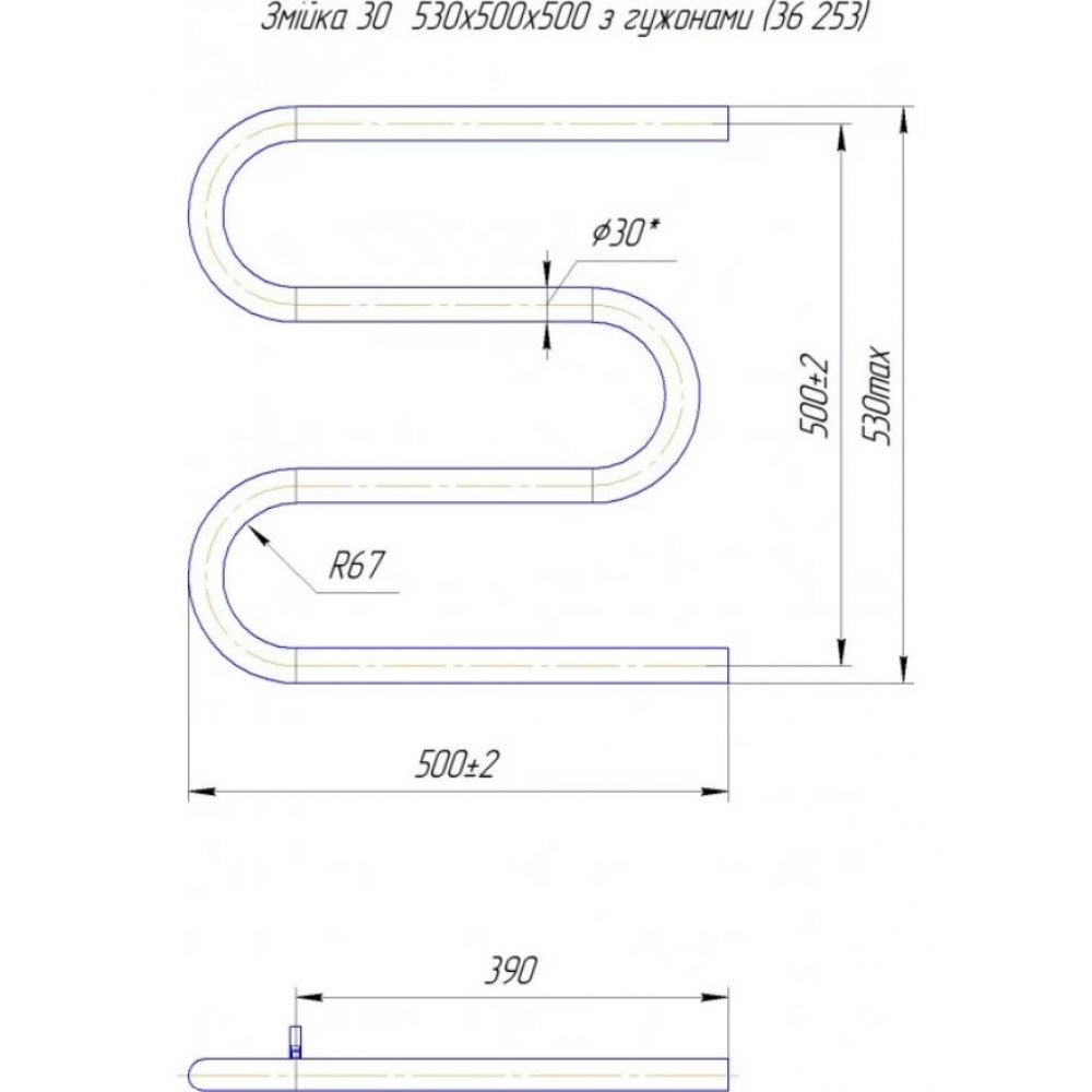 Водяна рушникосушарка Змійка ∅30 530х500 з міжцентровою відстанню для підключення 500 мм, діаметр підключення G 1/2'' 3 згина. Рушникосушарка Змійка 30 з боковим підключенням виробляється на нашому підприємстві Mario з 1998 року.