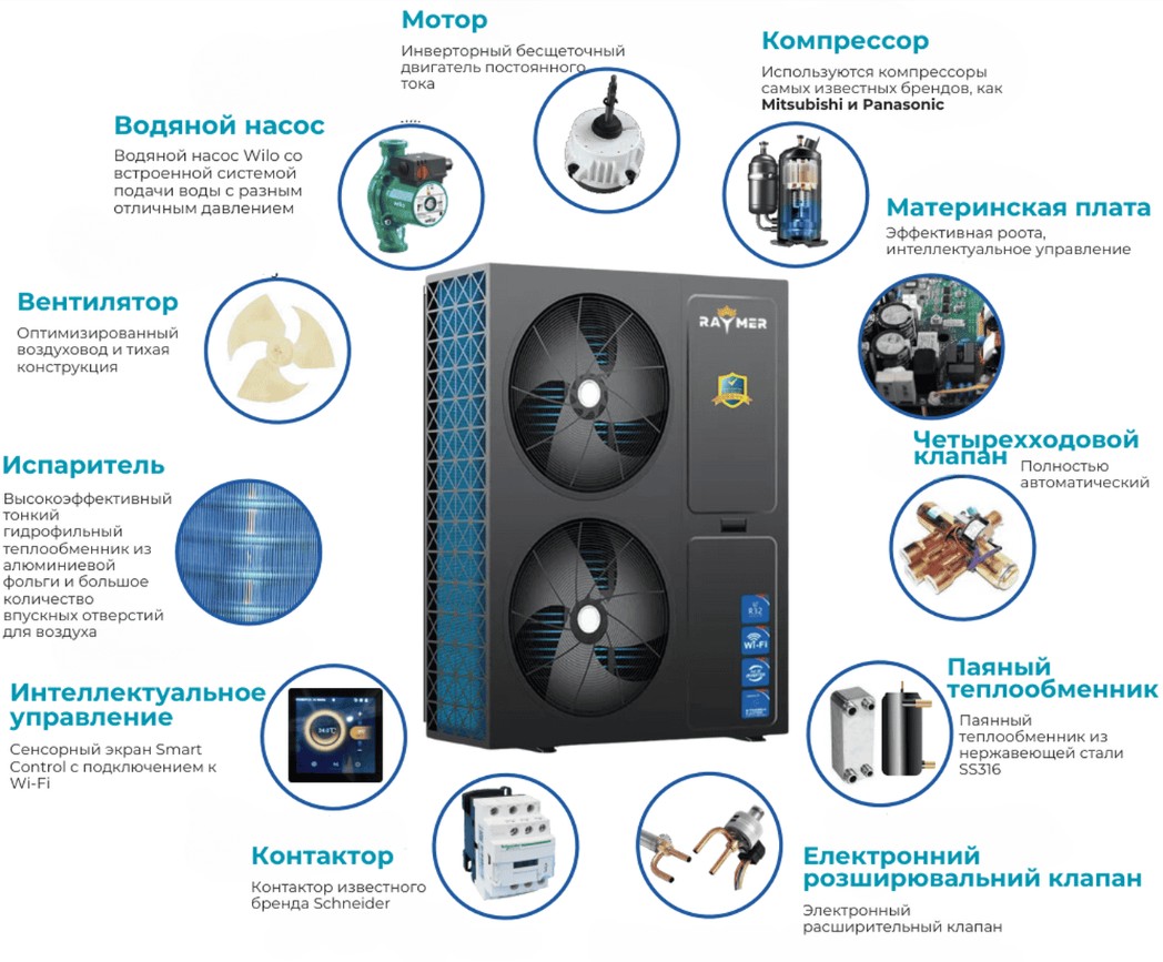 Тепловой насос Raymer Ray-18D2MN-EVI имеет продуманный набор, обеспечивающий высокую эффективность, надежность и удобство эксплуатации.