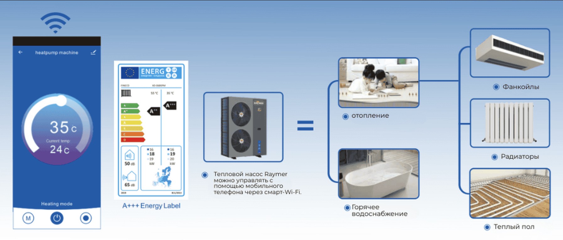 Тепловой насос Raymer Ray-18D2MN-EVI оснащен встроенным модулем Wi-Fi, позволяющим удаленно управлять системой через смартфон или планшет. Используя удобное мобильное приложение, пользователь получает полный контроль: