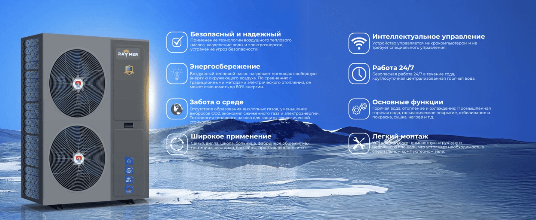 Используя экологически чистую энергию, этот тепловой насос способствует снижению выбросов CO2 и оказывает положительное влияние на окружающую среду.