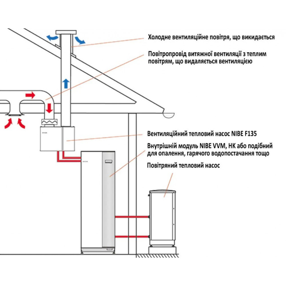 Вентиляційний тепловий насос - рекуператор NIBE F135 відбирає тепло з витяжного повітря вентиляції, повертає тепло в систему теплозабезпечення будівлі, автоматично розподіляє тепло між опаленням, підігрівом побутової води або басейну.