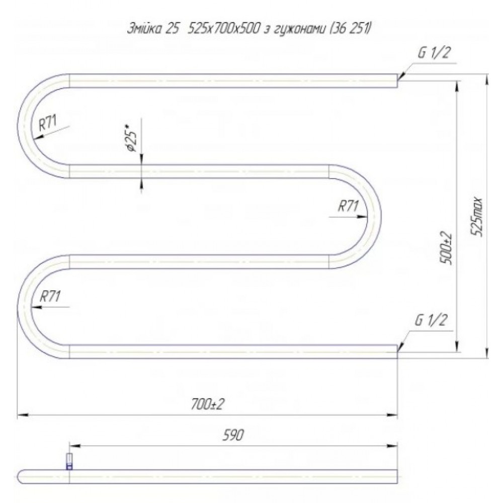 Водяна рушникосушарка Змійка ∅25 525х700/500 з міжцентровою відстанню для підключення 500 мм, діаметр підключення G 1/2'' 3 згина. Рушникосушарка Змійка 25 з боковим підключенням виробляється на підприємстві Маріо з 1998 року.