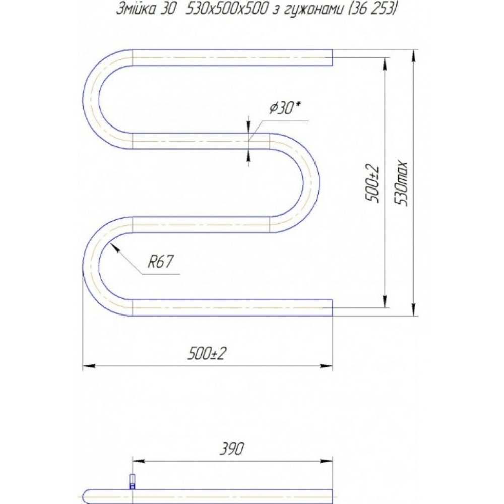 Водяна рушникосушарка Змійка ∅30 530х500/500 з міжцентровою відстанню для підключення 500 мм, діаметр підключення G 1/2'' 3 згина. Рушникосушарка Змійка 30 з боковим підключенням виробляється на підприємстві Маріо з 1998 року.