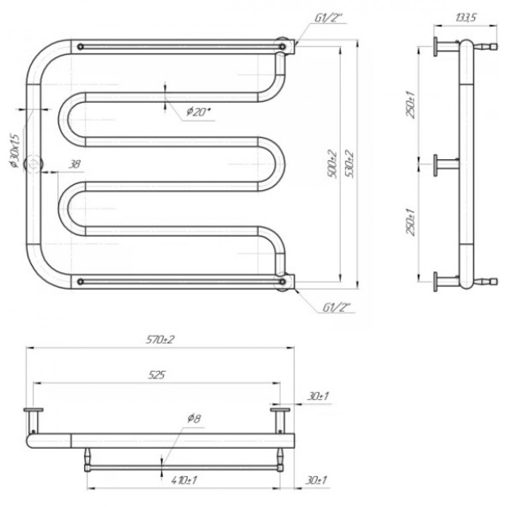 Водяна рушникосушка Mario INOX Фокстрот 530х570/500. Розміри: висота – 530 мм, ширина – 570 мм, глибина – 100 мм, міжосьова відстань для підключення – 500 мм, діаметр підключення G1/2’’. Кількість перемичок – 6, стояки виготовлені з круглої труби. Виготовлена з полірованої нержавіючої сталі без хромування. Для всесезонного використання водяну модель можна переобладнати на комбіновану, встановивши ТЕН. Сумісні аксесуари: поворотні полиці та навісні гачки для розширення функціональності. Рекомендовано підключати рушникосушарку за допомогою кранів Mario. Гарантія — 50 років у закритій системі опалення, 5 років — у централізованій.