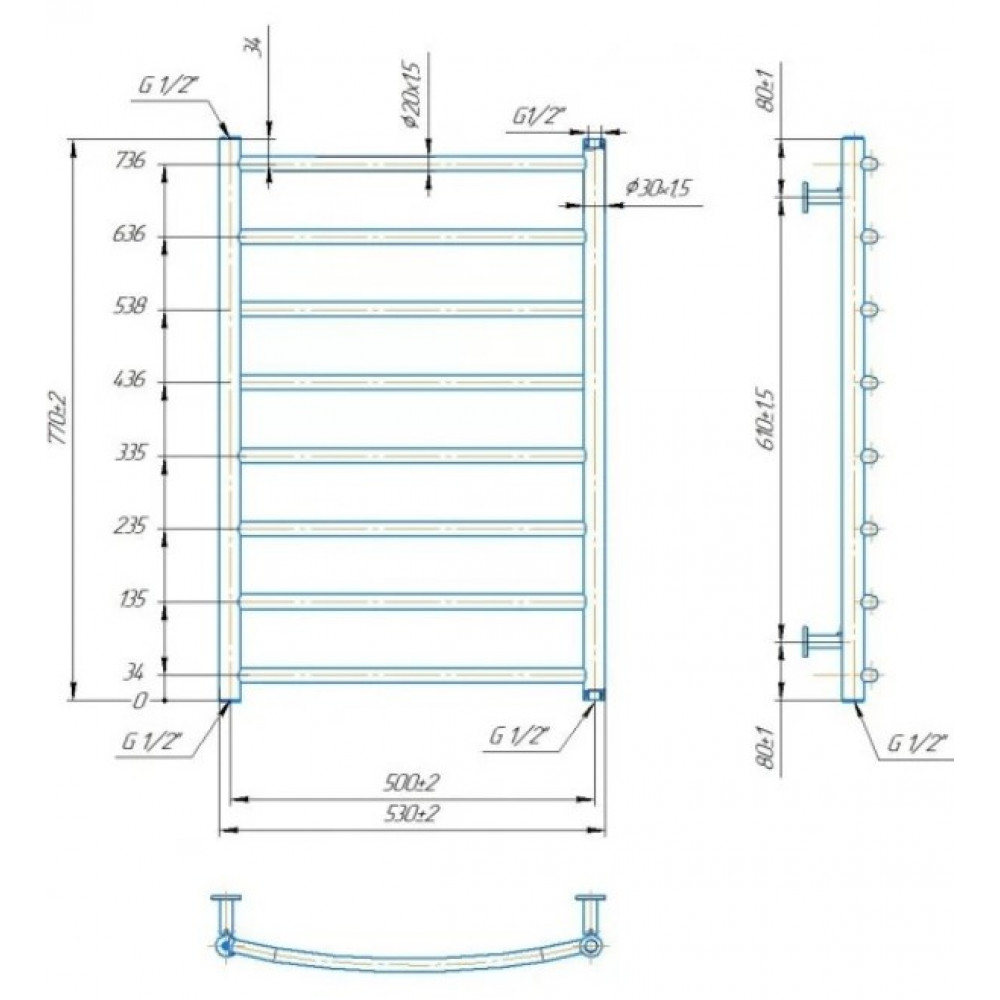 Водяна рушникосушарка Класік 770x530/500 діаметр підключення G1/2'', складається з 8 ребер. Має розміри: висота - 770 мм; ширина - 530 мм; міжцентрова відстань - 500 мм; глибина - 90 мм. Теплова потужність рушникосушарки - 205 Вт. Варіанти підключення рушникосушарки нижне або діагональне. Рушникосушарка Класік 770x530/500 поєднує в собі не лише привабливий зовнішній вигляд, надійність й практичність, а ще можливість зробити комбінований виріб за допомогою підключення ТЕНа і крану під ТЕН. Рекомендована потужність ТЕНа – 200 Вт. Крани та ТЕН ви можете переглянути в аксесуарах до рушникосушарки. Рушникосушарка виготовлена за новітніми технологіями із нержавіючої сталі марки AISI 304, товщина стінок труби - 1.5 мм.