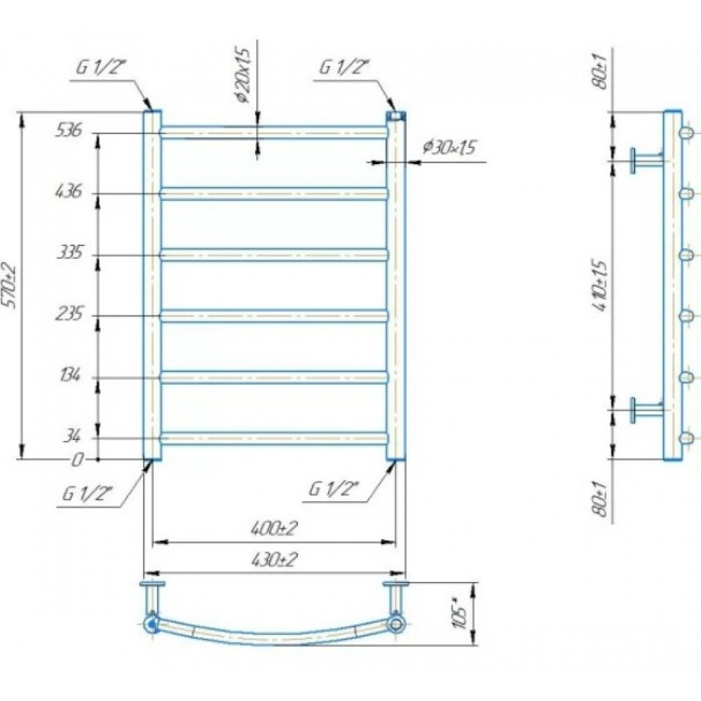 Водяной полотенцесушитель Классик 570x430/400 диаметр подключения G1/2'', состоит из 6 ребер. Характеристика товара: Имеет размеры: высота – 570 мм; ширина – 430 мм; межцентровое расстояние – 400 мм; глубина – 85 мм. Тепловая мощность полотенцесушителя – 133 Вт. Варианты подключения полотенцесушителя нижнее или диагональное. Полотенцесушитель Классик 570x430/400 сочетает в себе не только привлекательный внешний вид, надежность и практичность, а еще возможность сделать комбинированное изделие посредством подключения ТЭНа и крана под ТЭН. Рекомендуемая мощность ТЭНа – 120 Вт. Краны и ТЭН можно посмотреть в аксессуарах к полотенцесушилке. Универсальное решение для Вашей ванной вне зависимости от принятого дизайнерского решения в оформлении интерьера. Полотенцесушитель изготовлен по новейшим технологиям из нержавеющей стали марки AISI 304, толщина стенок трубы - 1.5 мм.