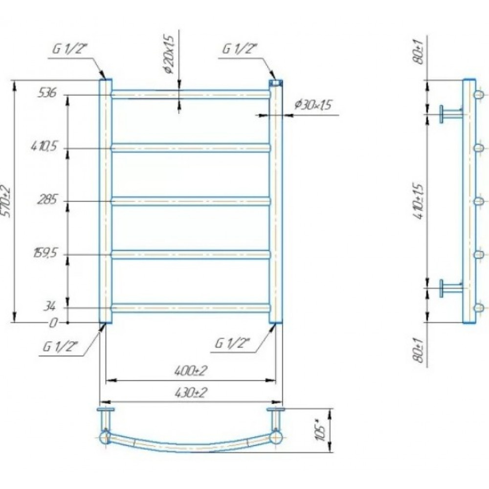 Водяное полотенцесушитель INOX Классик HP 570х430/400 с межцентровым расстоянием для подключения 400 мм, диаметр подключения G 1/2'' состоит из 5 ребер. Полотенцесушитель Классик HP завода-производителя Mario изготовлена из нержавеющей стали АИSI 304.
